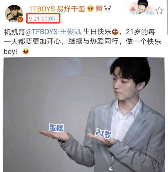 9月21日是王俊凯的21岁生日,自然少不了tfboys另外两小只的祝福,两个好兄弟都在零点踩点发文为小凯送祝福。