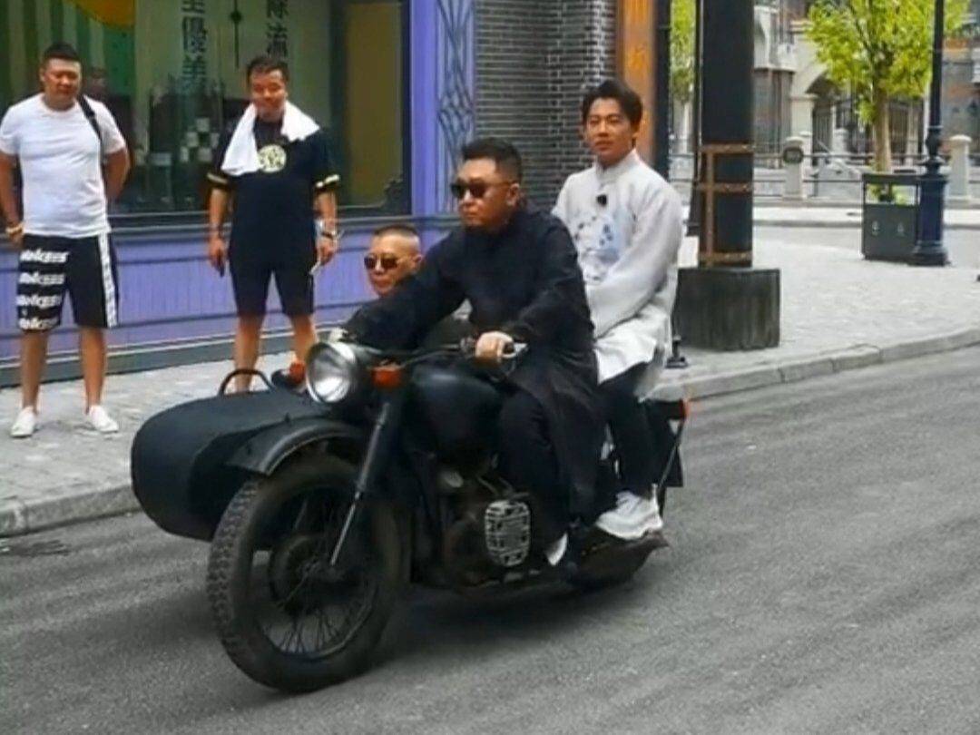 而在节目现场,于谦老师骑着摩托车,载着郭德纲、郭麒麟父子,“一家三口”就在该影视基地转悠了起来。