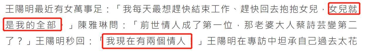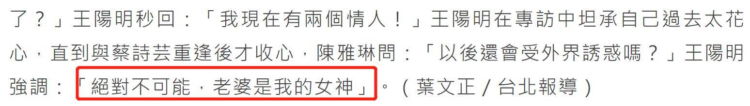 除此之外,王阳明的多段感情也常被人说道。王阳明在受访时也承认自己早前确实很花心,但重逢妻子蔡诗芸后便收心。