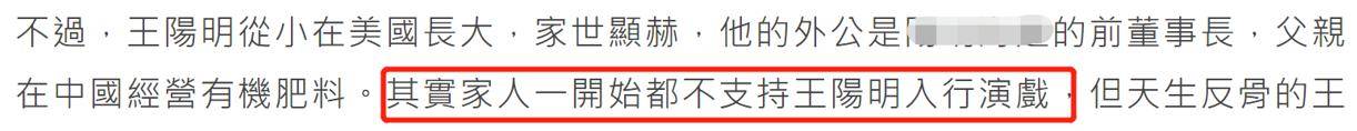 而现实生活中,王阳明是名副其实的富三代,起初家人不支持他进演艺圈,并强调不会给他提供任何帮助,还不准他回家讨要工作。
