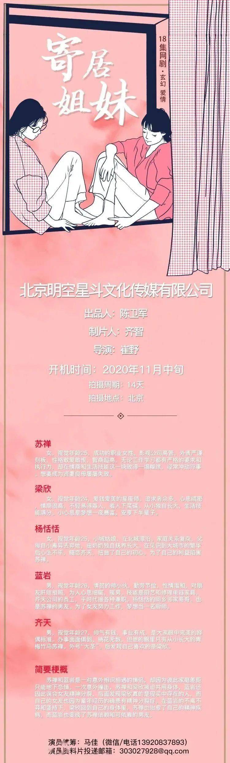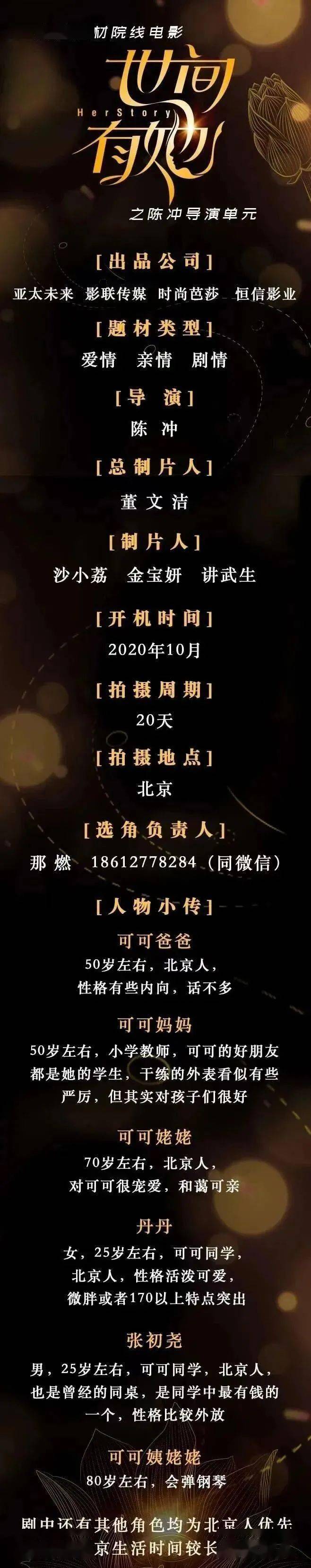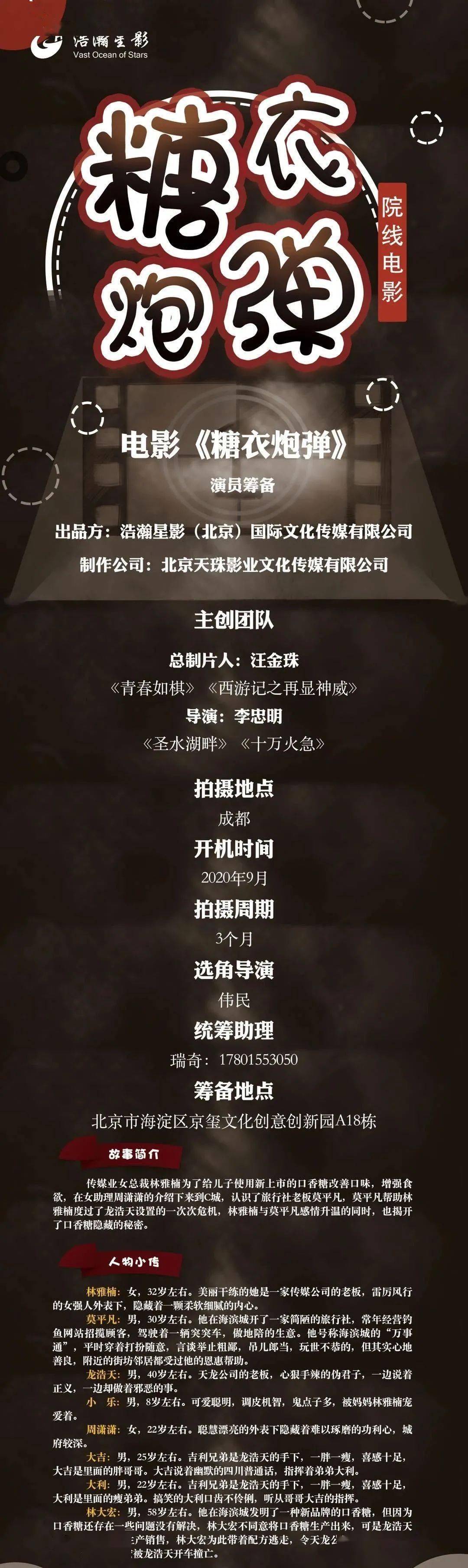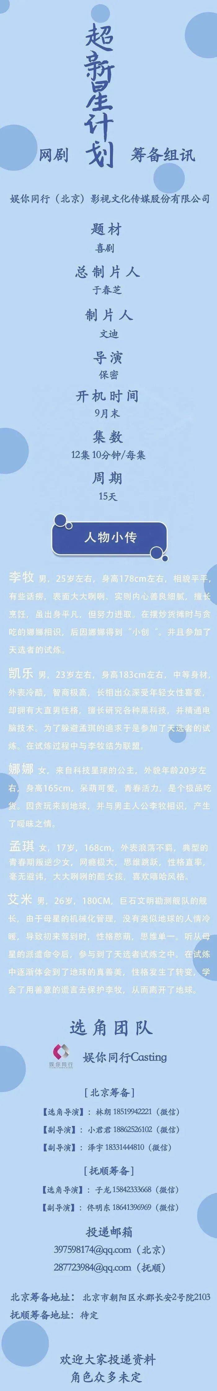 10月6号以后筹备地址更新。详情组讯同步。本剧需要大量年轻角色,欢迎经纪公司和演员投递资料。