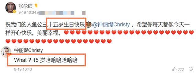除此之外,张伦硕在钟丽缇生日当天发文祝老婆"15岁"生日快乐,这个年龄成功逗笑了寿星钟丽缇。