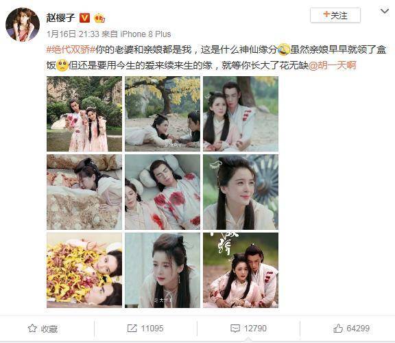 胡一天与赵樱子是在2020版《绝代双骄》中相识,都是花家人,不过他们戏中关系还是有点复杂的,胡一天一人分饰两角,既是花月奴丈夫,又是他儿子,刚来个虐恋情深,镜头一转马上叫娘,这种跳脱感,还是让人有些出戏的。