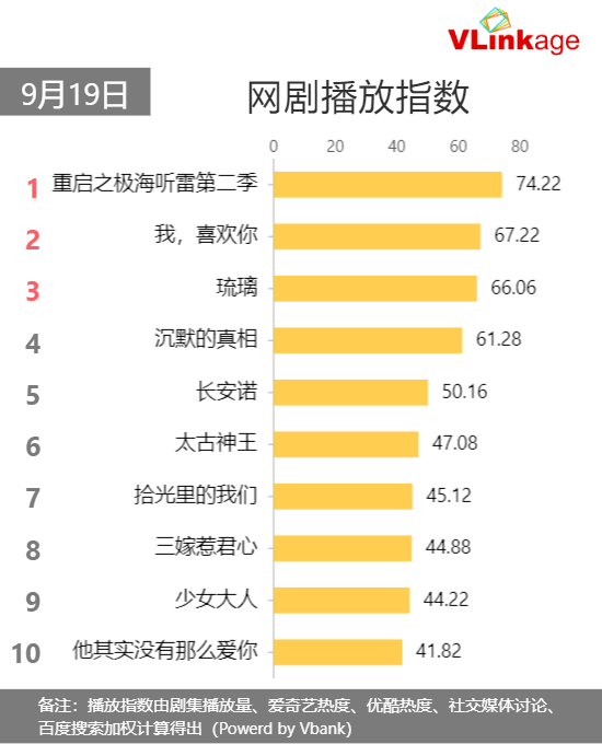 【网络剧榜单】9月19日当日#网剧播放指数#:1.#重启之极海听雷第二季# 播放指数 74.22 2.#我,喜欢你# 3.#琉璃# 4.#沉默的真相# 5.#长安诺# 6.#太古神王# 7.#拾光里的我们# 8.#三嫁惹君心# 9.#少女大人# 10.#他其实没有那么爱你#
