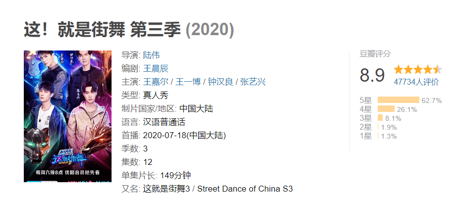 不仅热度居高不下,长期占据综艺榜单前列,同时作为系列综艺的第三季,《街舞3》在豆瓣开分就获得了9分的成绩。