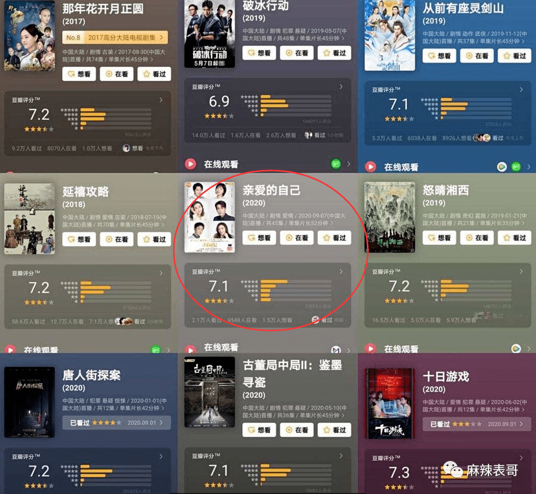 豆瓣评分也不高,也不知是刘诗诗的粉丝还是朱一龙的粉丝,制作了近些年较红的剧对比图,说《亲爱的自己》同样有7.1分,证明这剧还是火了。