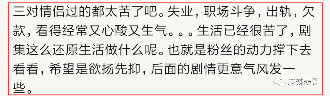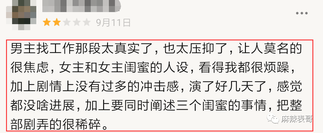 要说,这部剧反应的情况,现实倒是很现实,甚至比《三十而已》要更贴近现实一点,有大龄青年找工作的困境,家长里短里的重男轻女,刁蛮婆婆,但没有人看剧,是为了把现实再看一遍。