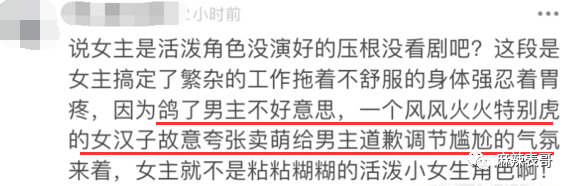 但粉丝急着解释,这一段是有前因的,说刘诗诗在剧中是风风火火的女汉子人设,因放了男主的鸽子,才故意夸装卖萌给男主道歉,调节气氛。
