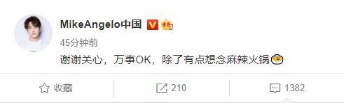 9月18日晚,泰国男星Mike发表动态,表示"谢谢关心,完事OK,除了有点想念麻辣火锅"。粉丝调侃Mike还是一如既往地喜欢火锅,气氛轻快了起来。