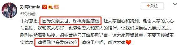 事情发酵后刘涛先否认一通,解释自己是因为父亲去世才发文表感伤,与老公无关。