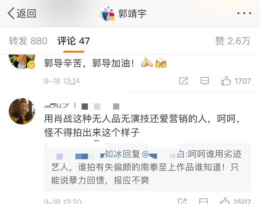 还是有肖战的黑粉在郭靖宇微博评论区进行抨击,看来他们对郭靖宇使用肖战拍戏很不爽,所以编剧和电视剧都被吐槽。