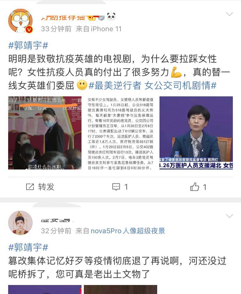 郭靖宇是抗疫剧《最美逆行者》总编剧,9月17日播出七个小故事中的第一个《逆行》,有一处情节是讲公共汽车司机李文丽报名参加抗疫接送其他抗疫一线工作人员的情节,网友认为失真。