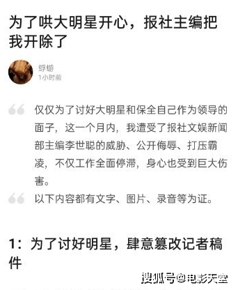 在晒出的曝料长文中,不只是有聊天记录,还有各种录音证据等等。总而言之,大概意思就是娱乐圈某位大明星利用自身的影响力向报社施压,要求修改这位记者已经完成的某篇稿子,只不过没想道该记者也是个硬茬子,宁死不从,结果就被想要讨好这位明星的领导要求辞职。消息被曝之后由于涉及到娱乐圈明星,也就引起了吃瓜群众的关注。