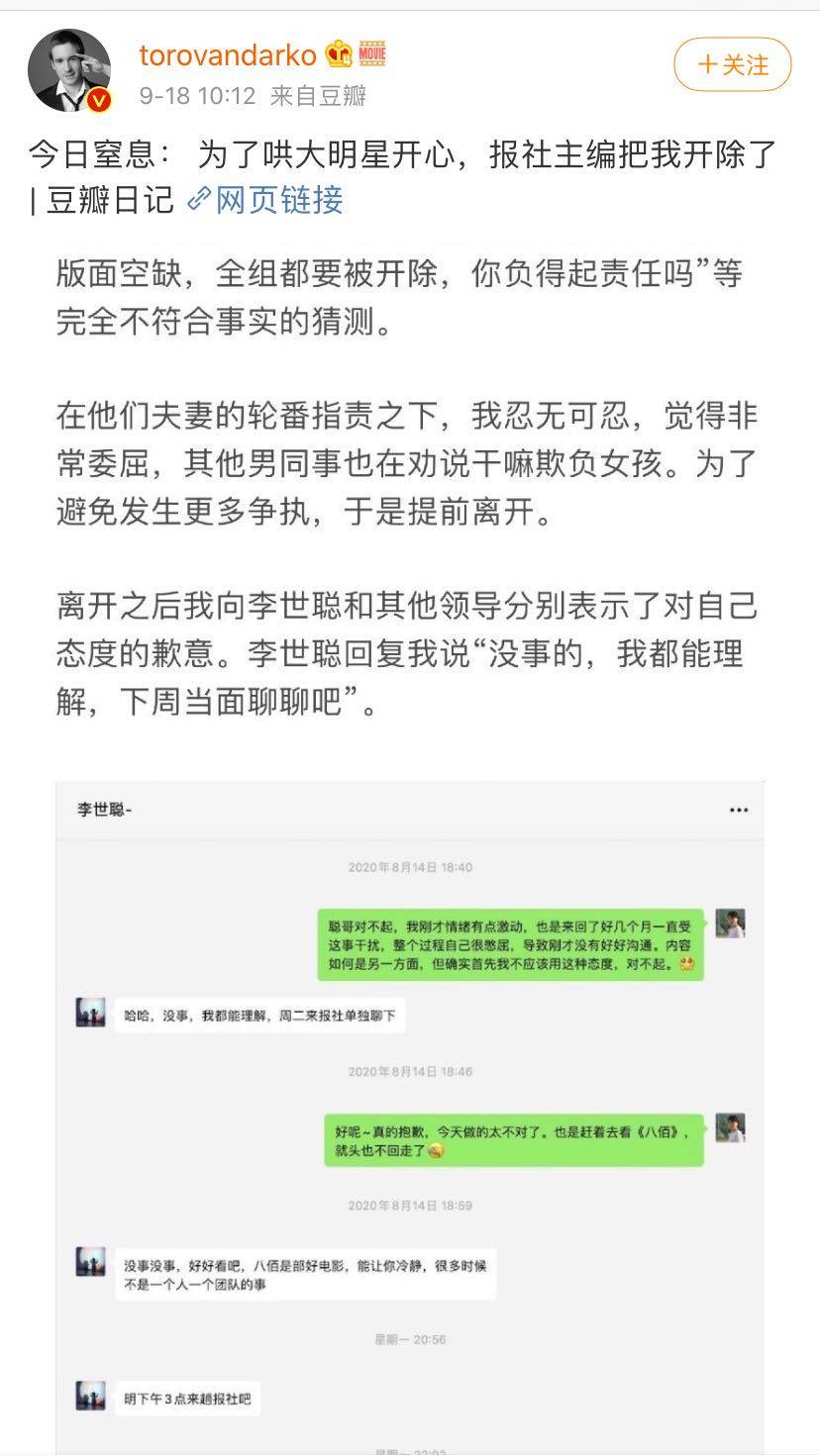 某报的前娱记在微博上发布了自己因为采访徐姓导演的文章被领导让改稿,结果闹得很不愉快,最终被开除,拿到的稿酬也很低,觉得很冤枉,所以曝光了整件事,目前相关方面当事人都没有回应,这位娱记也向上级反映,但最终也没有获得圆满的解决,所以很气愤才让大家看“真相”。