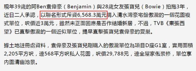 袁伟豪与张宝儿自2017年公开恋情,一直感情稳定,近年来频频有媒体猜测两人好事将近。今年5月,有港媒爆料两人联名买下一栋价值6600万的豪宅,但被问及是否购置婚房,但两人均未作出回应。