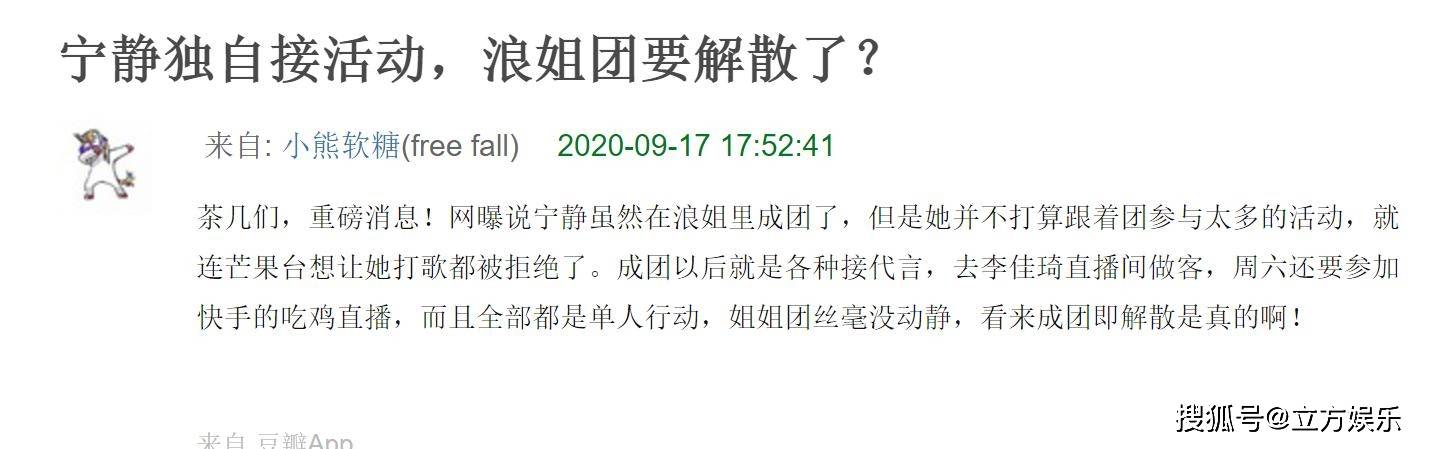 有网友称,虽然宁静在节目当天和其他女演员一起成团,但是她并不打算跟团体一起参加很多活动和节目。连芒果台要求她们一起打歌,都被宁静拒绝了。因此许多网友都在怀疑,是不是这个团体还没成团几个月就要解散了呢?有网友在评论区表示,宁静在成团当夜就被其他团员黑了,而且连一个道歉也没有。其实,宁静单独行动想要退团,早就有行动来表明了。