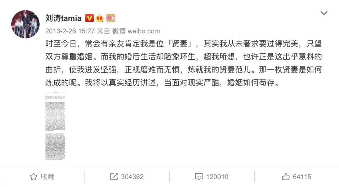 2013年2月16日,刘涛发布了一条数千字的微博,正式回归娱乐圈。