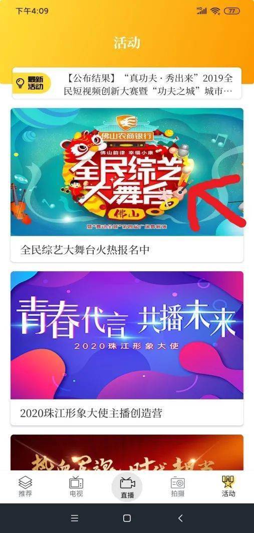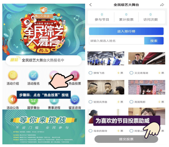 两天海选中选出较好的节目,通过“醒目视频”APP“全民综艺大舞台”专栏网络“人气”投票活动,票数最高的2个节目成为网络人气节目,并晋级镇街晋级赛。(投票步骤详见下文)