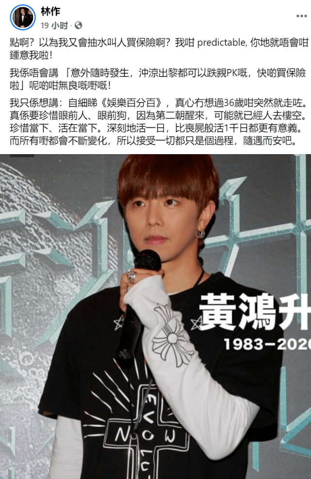 黄鸿升死讯曝光后,林作又蹭起了热度反问大家是不是以为他又趁机卖保险,语气挑衅让人不舒服。林作还为自己洗白“我是不会讲‘意外随时发生,洗澡出来都可以跌倒,快点买保险啦’这类无良心的话”,难道他忘了自己之前是怎么消费已故男星博斯曼了吗?林作最后还阴阳怪气说了一句“要珍惜眼前人、眼前狗,可能第二天醒来就人去楼空”。林作与黄鸿升没什么交集,却在这时候假模假样发了一大段与自己毫无关联的话,很难不让人多想。