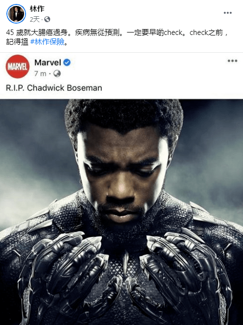为了工作业绩,林作连脸面都抛开不管开始蹭起了去世之人的热度。早前《黑豹》主演查德维克·博斯曼去世,林作就蹭热度呼吁大家在自己这里买保险,遭到了不少网友的反感。博斯曼已经去世,林作不发文悼念也就作罢,反而借机为自己招揽生意,实在是叫人难以理解。话说回来,这样满脑子都是利益的保险经纪人大家也不会太过信任,林作此举只会给自己招黑。