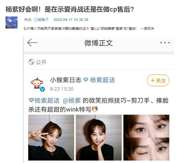 9月17日,有网友在社交平台上发文写道“杨紫好会啊!是在示爱肖战还是在做CP售后”。该网友的一句“杨紫示爱肖战”,立即引起了吃瓜群众围观,毕竟在流量明星的恋情传闻上,网友们可都是抱着“宁肯吃错一千,不肯放过一个”的态度。为了让吃瓜群众看得更加清楚直白,该网友也把自己的发现一项项列了出来,以便吃瓜群众谨慎吃瓜。