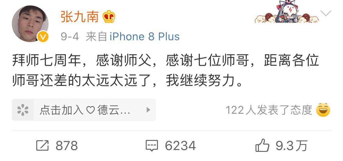 在拜师五周年的纪念日,包括孙九香、何九华、尚九熙在内的郭德纲多名“九字科”弟子,争相发文表达了对德云社的感恩之情,并表示了对师父郭德纲的忠心。