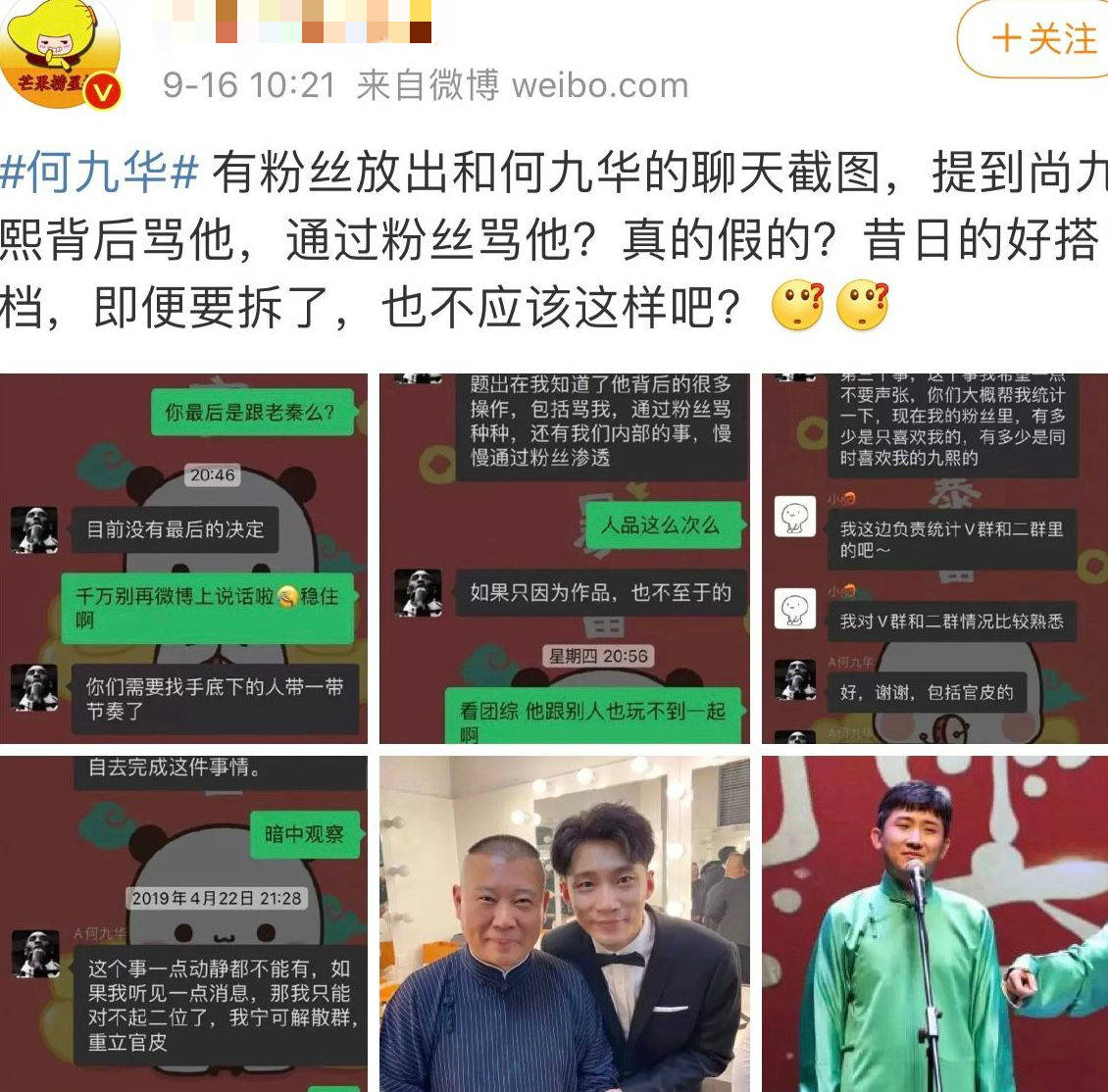 不过,就在粉丝为何九华将继续留在德云社为德云社、师父郭德纲效力而感到高兴的时候,就在今天,也就是9月16日,突然有网友在微博上爆料了一组据说是何九华与粉丝的对话截图。