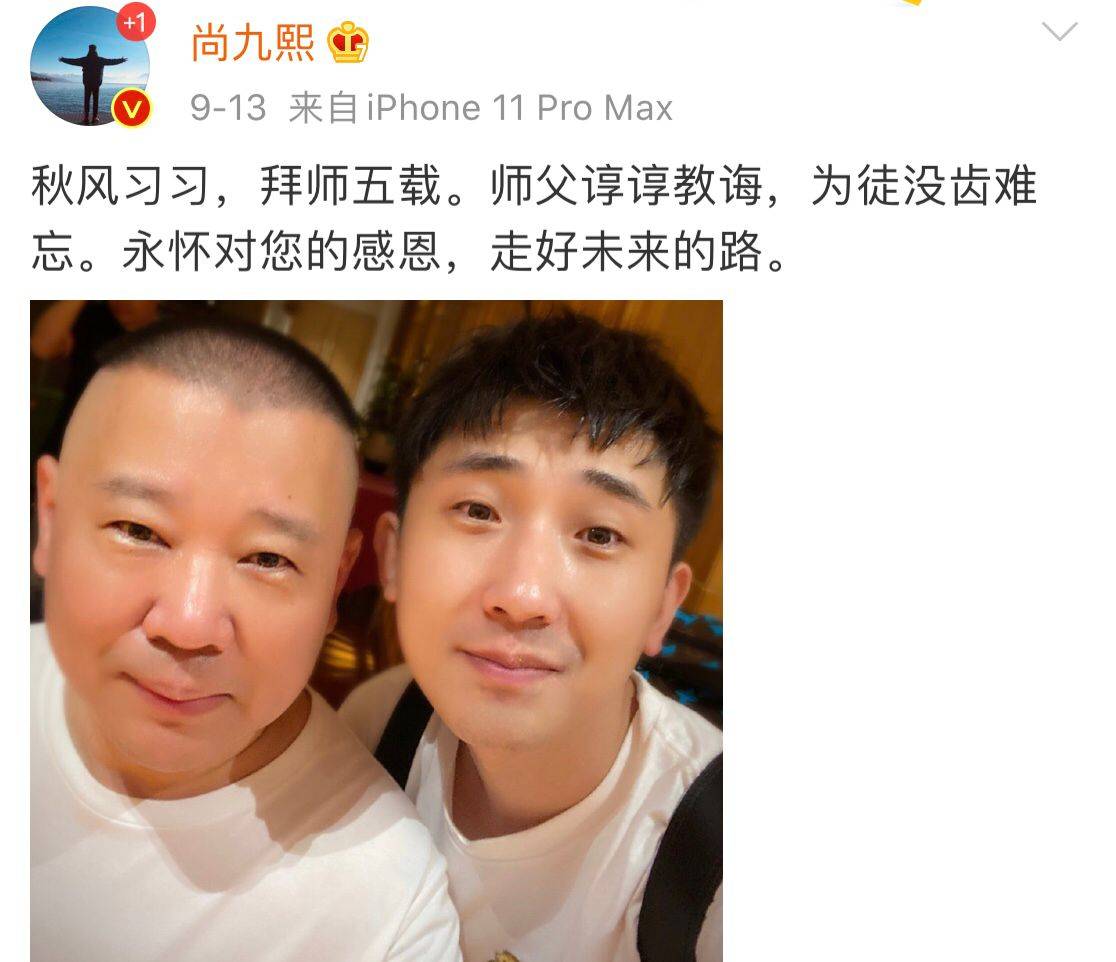 尚九熙也在9月13日这一天,发文感谢了德云社,以及师父郭德纲。