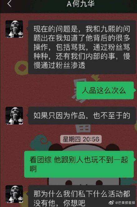 其中一张截图的内容显示,何九华告诉粉丝说:现在的问题是,我和九熙的问题出在我知道了他背后的很多操作,包括骂我,通过粉丝骂种种。还有我们内部的事情,慢慢通过粉丝渗透......