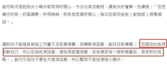 当被提及刘恺威工作量远少于杨幂时,刘丹极力否认,他表示刘恺威转战话剧领域:"他的目的是想挑战自己。为了演话剧,他已经推掉了两部电视剧。他是应该有一个新的尝试,接受新的挑战。"