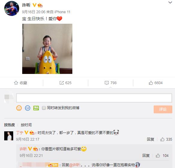 见证了许昕向妻子姚彦求婚成功的丁宁给许昕留言表示:“时间太快了,都一岁了,真是可爱的不要不要的!”许昕也傲娇的回答道:“你看图片哪知道有多可爱!”许昕的这个回答也被球迷指出是“来自老父亲的炫耀”、“赤裸裸的夸儿子”,不过也有球迷吐槽:“说得你好像一直在抱着实物!”确实,在儿子出生的时候,许昕正在参加亚锦赛,没有亲眼见证来自来到这个世界,随后又因为训练比赛,再加上疫情影响,一直在外面,错过了太多陪伴儿子的时间。国乒在6月底放假的时候,许昕回到上海见到了宝贝儿子,不过也没有待在一起太长时间,许昕在7月20号就到海南与国乒会合,准备接下来的训练比赛了。