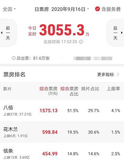 截止到9月16日,已经上映近一个月的《八佰》当日票房超过1500万,而这部电影仅为600万左右,但排片占比却高达30%,高于《八佰》的29.7%,但上座率仅为1.4%,说明观众购票入场的意愿很低,这主要是因为电影口碑太差导致。