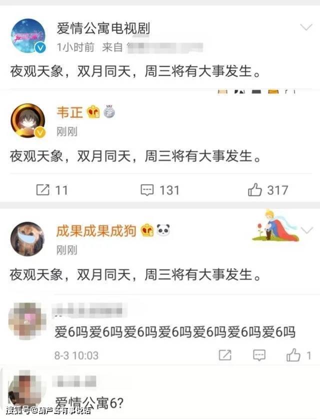 即便如此,它也算是已经结尾了,但是没想到就在这几天,李佳航,成果,韦正,就连《爱情公寓》的官方微博都发了一句话,暗喻周三会有大事发生。于是很多人便猜想了,难道是还要出《爱情公寓》的第六季了吗?