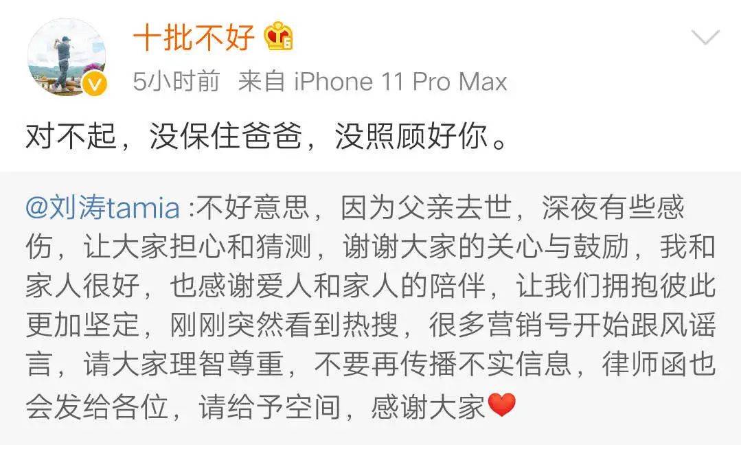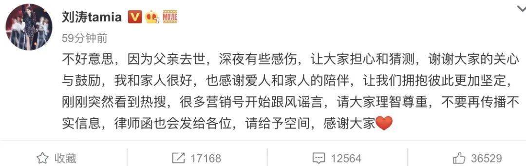 不过,在传闻出来不到半天,刘涛就微博发文回应称是“父亲去世,深夜有些感伤,让大家担心和猜测。我和家人很好。”并表示营销号跟风谣言,请大家理智尊重,不要再传播不实信息。