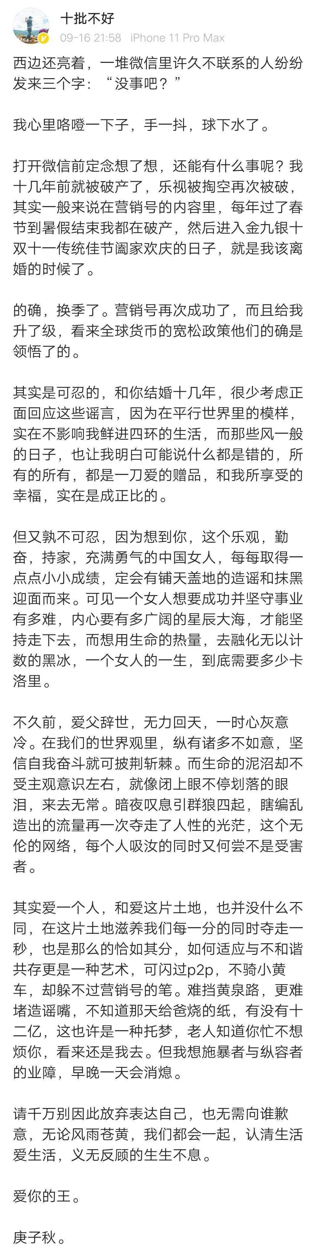今晚,刘涛老公王珂再次在微博发长文回应被造谣投资亏损一事,他表示在营销号的内容里自己每年都要破产和离婚:“瞎编乱造出的流量再一次夺走了人性的光茫。”