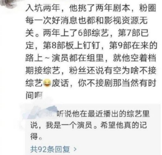 粉丝直言,这算什么工作?是忘记自己本职是个演员了吗?更有人暴躁发言“年初就说在挑剧本,快一年了,是把粉丝当猴耍吗?到底是想挣快钱录综艺,还是拍戏当演员?最好认清自己本职工作,不想拍戏就退圈。”