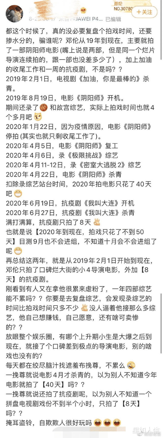有粉丝补充,邓伦两年上了六部综艺,第七部已定,第八部板上钉钉,第九部在来的路上。演员都在组里,只有他空着档期接综艺。