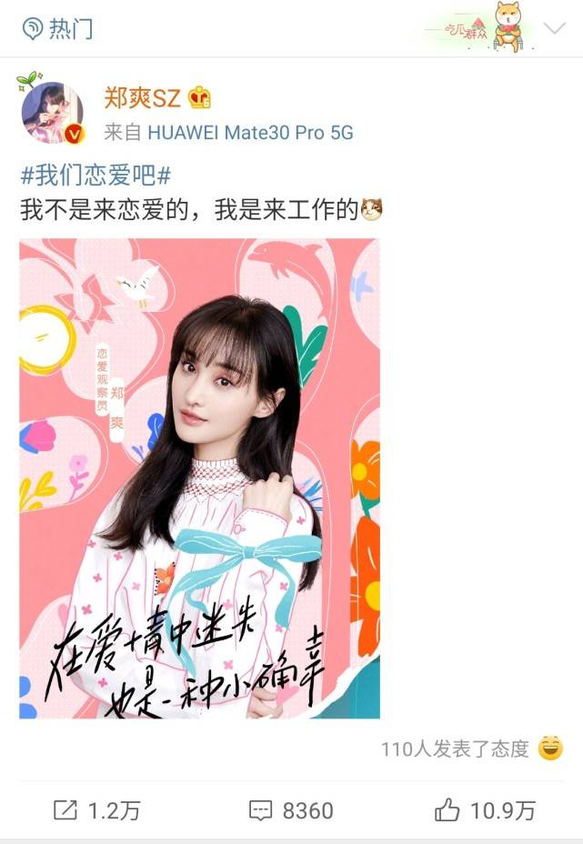 今日,郑爽微博官宣新综艺《我们恋爱吧2》,并配文“我不是来恋爱的,我是来工作的。”艺人官宣工作,按理来说,粉丝应该是最开心的吧。但这条官宣博下,热赞粉丝留言却不是那么友好。