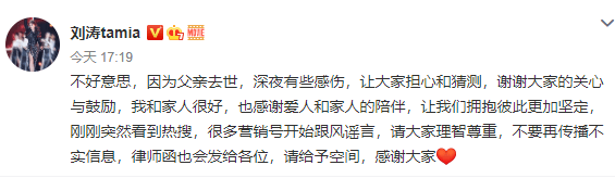 刘涛这几天更新的微博动态不太好,有很多人猜测是不是要和王珂离婚了,没想到下午的时候刘涛回应了,她说自己之所以那么感伤, 是因为父亲去世了。。。
