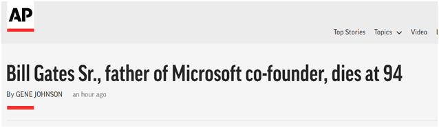 比尔盖茨的父亲今天也宣布去世了,享年94岁,真真实实的寿终正寝啊,是因为阿尔茨海默病去世的,也就是俗称的老年痴呆。