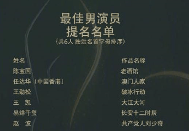 看这份提名名单:陈宝国、任达华、王劲松、王凯、易烊千玺角逐最佳男演员奖;