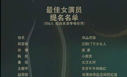 有中国进入21世纪以来,全部作品收视率总和成绩最佳的女演员,此次依靠《正阳门下小女人》提名的蒋雯丽、多年未出演现代剧,这次在《安家》中饰演房产中介的孙俪、已经靠着《小欢喜》拿了不少奖,被秦海璐称为“只要一演戏就得奖”的小陶虹、终于摆脱掉小章子怡标签,在《大江大河》赚足观众眼泪的童瑶以及在很多网友眼里名字有点陌生,《岁岁年年柿柿红》的女主角王茜华。