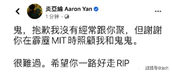 炎亚纶发文说:"抱歉我没有经常跟你聚,但谢谢你过去的照顾。"
