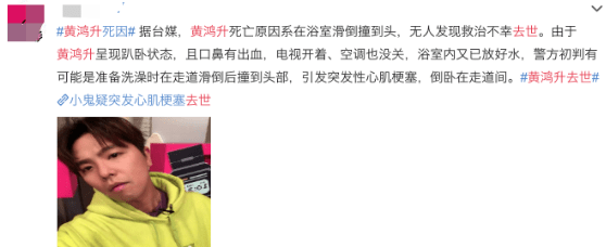 据台媒,小鬼被发现时,尸体已经僵硬,年仅36岁,目前经纪人已经证实该噩耗。据警方推测,黄鸿升死因系在浴室滑倒撞到头,无人发现救治不幸去世。由于黄鸿升呈现趴卧状态,且口鼻有出血,电视开着,空调也没关,浴室内又早已放好水,警方初步判断可能是准备洗澡时在走道滑倒撞到头部,引发突发性心肌梗塞。