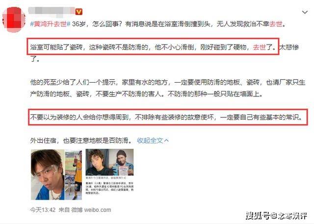 为此,很多粉丝包括大V,为了能够让偶像黄鸿升死得瞑目,纷纷将矛头对准了给他家公寓浴室做装修的人,怀疑对方故意使坏,没有使用防滑瓷砖,最终导致意外发生。