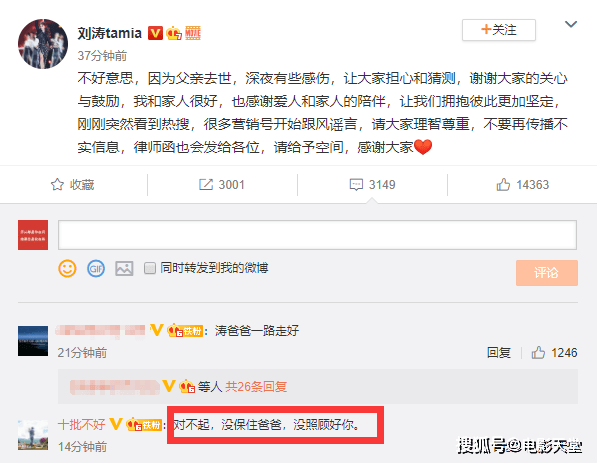 刘涛否认了网上关于王珂投资失败的说法,表示前段时间之所以发那些话的真正原因,是因为父亲去世跟王珂投资失败没有任何关系。随后王珂也在评论中回复道:“对不起,没保住爸爸,没照顾好你”。