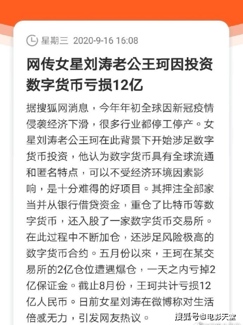 根据某知名财经账号爆料,刘涛的老公王珂今年开始投资数字货币,为此几乎押上了全部家当并且还借贷了很多资金,还入股了一家交易所。但是王珂这次投资却惨遭滑铁卢,从五月份开始全面崩盘,截止八月亏损金额已经超过12亿。