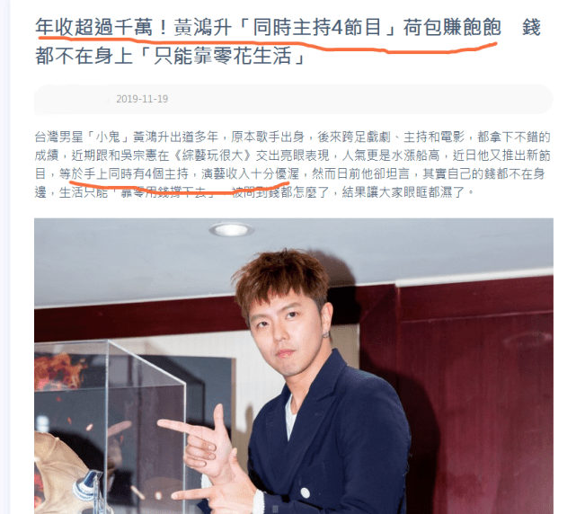 除此之外,黄鸿升这几年的事业可以说是稳步提升,收入更是水涨船高,光是手头四个节目的主持费就高达上千万台币。