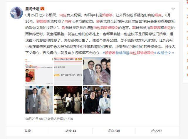 但这只是起点,节目结束后,两人的动态才是重头戏,吃瓜群众大开脑洞,联系向太郭爸的社交平台发言,整理出一大堆疑似两人婚后感情不好的线索,这些就不一一列举了,反正都如出一辙。