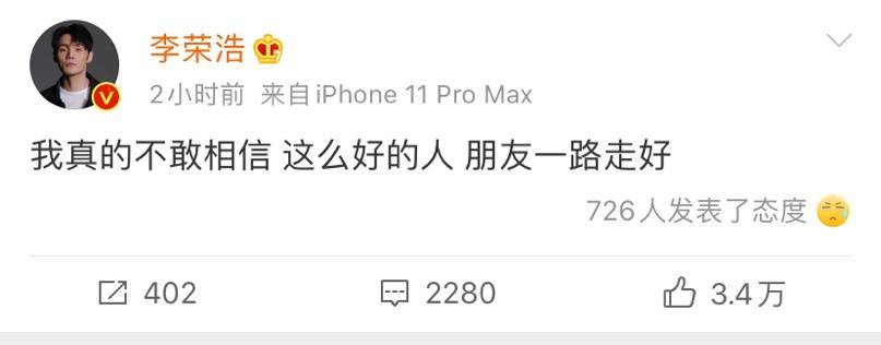 杨丞琳的老公李荣浩也发文悼念,真不敢相信,这么好的人,朋友一路走好。看来是杨丞琳的好友必然也是李荣浩认识的人,两人一定了解应该也是好友。